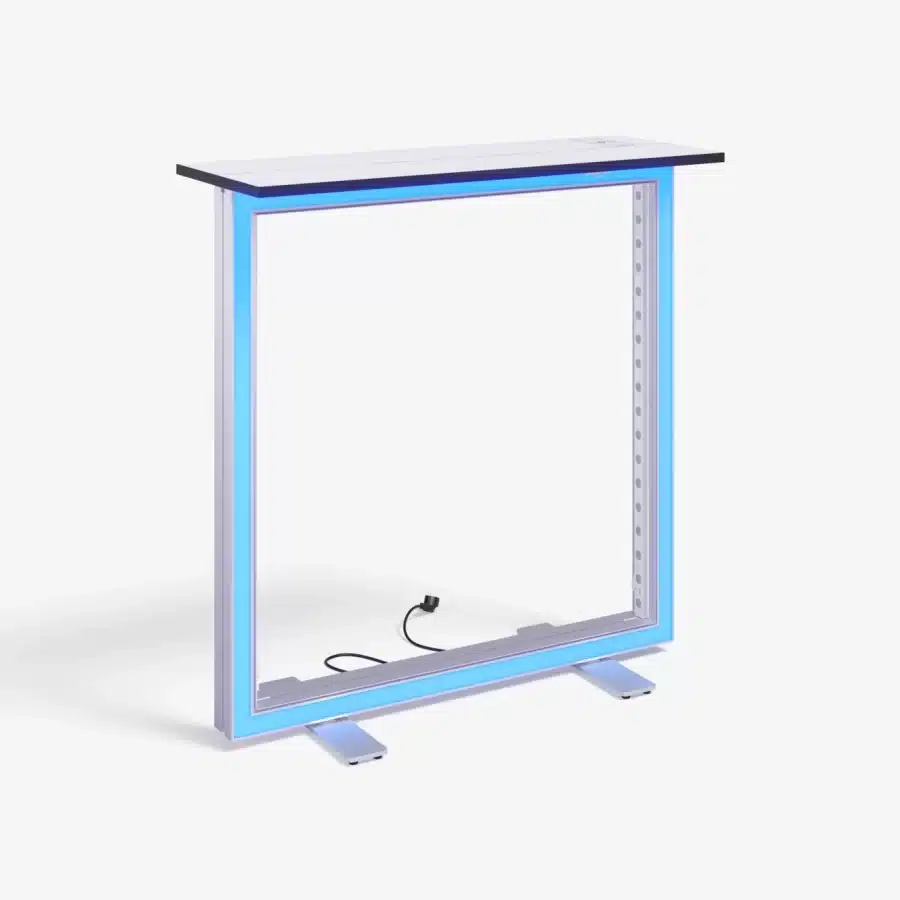 adTribune Lumina RGB on messutiski, joka on suunniteltu huomiota herättäviin esillepanoihin. Tuotteen etuosassa on RGB-LED-nauha. Mukana tulevalla kaukosäätimellä voit säätää koko RGB-värivalikoimaa ja sovittaa valaistuksen sävyn osastollesi, logollesi tai tapahtuman teemaan. Mutta siinä ei ole vielä kaikki – tiskin yläosassa on sisäänrakennettu langaton laturi. adTribune Lumina RGB:n avulla voit esitellä brändiäsi luottavaisin mielin messuilla ja pitää jokaisen vierailijan kanssa käytävän keskustelun stressittömänä ja laitteesi täyteen ladattuna.