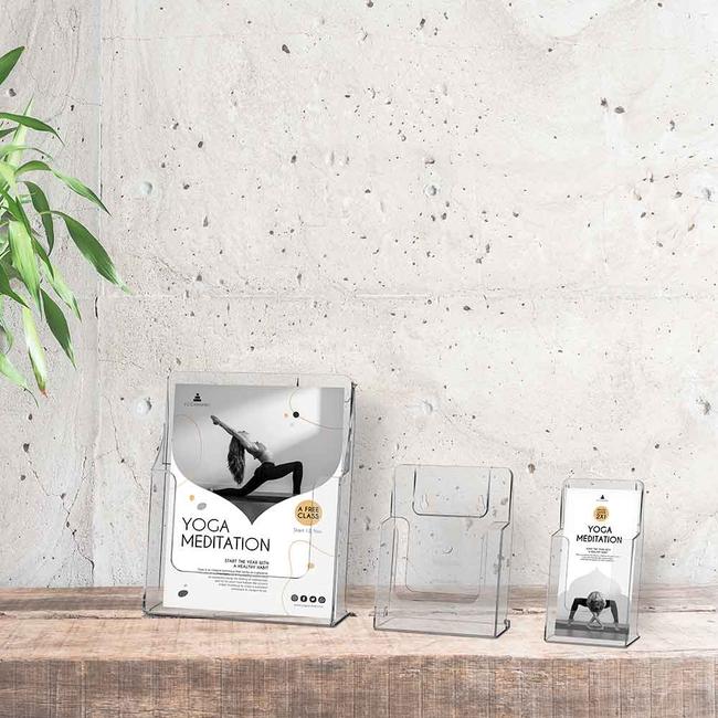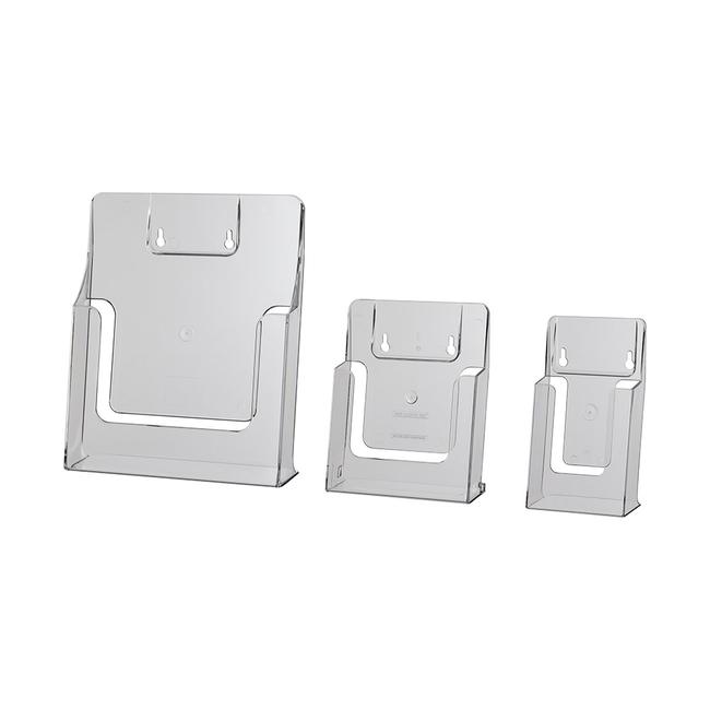 Tämä läpinäkyvä, pystymallinen esiteteline on täydellinen ratkaisu kaikenlaisten esitteiden esillepanoon. Kahdella kiinnitysreiällä varustettu esiteteline sopii paitsi pöytäkäyttöön myös seinäasennukseen. Erikseen myytävää kiinnitysadapteria käyttämällä se voidaan asentaa myös urapaneeliin tai muihin esitetelinekokonaisuuksiin (mm. ”Tondo”-esiteteline).