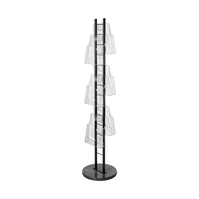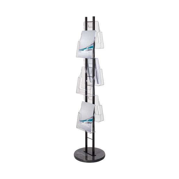 Metalliseen runkoon voidaan kiinnittää molemmille sivuille 6 x A4-, 8 x A5- tai 8 x 1/3 A4-esitelokeiroita pystysuunnassa. Ne ripustetaan helposti adapterien avulla mihin tahansa rungon puolaan. Jokaisessa esitelokerossa on noin 30 mm:n täyttösyvyys – korotettujen sivujen ansiosta esitteesi ja lehtesi pysyvät vakaasti paikallaan ja esillä näyttävästi. Runko on saatavana mustana tai valkoisena, ja jalustan väristä riippuen raskas marmorijalusta on joko musta/harmaa tai valkoinen/harmaa.