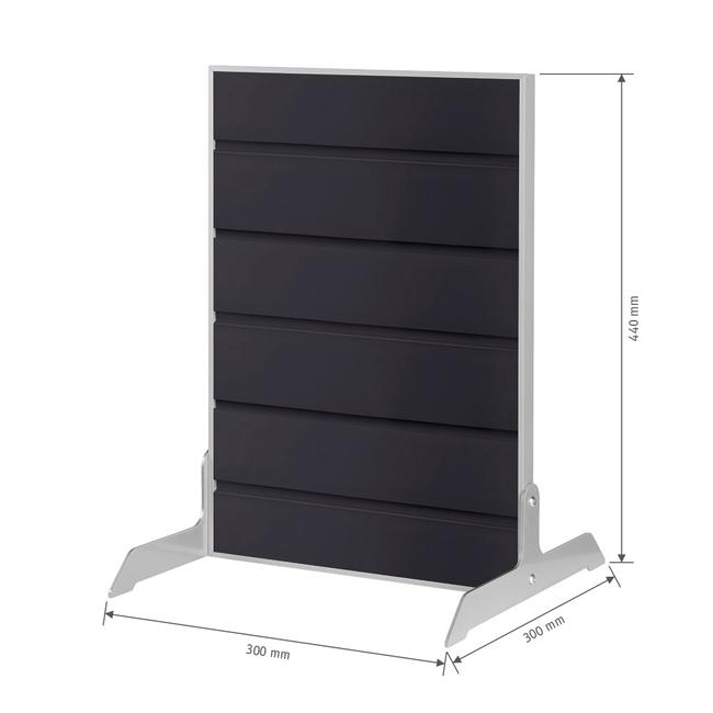 FlexiSlot®-pöytäteline, jonka teräsjalat on ruuvattu sivulle, voidaan sijoittaa tiskille myynnin edistämiseksi. Järjestelmä koostuu muovisesta slatwall-urapaneelista, joka on saatavana useina väreinä, ja hopeanvärisestä anodisoidusta alumiinikehyksestä. Teline vakuuttaa yksinkertaisella muotoilullaan.