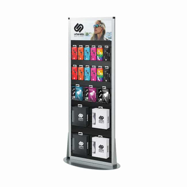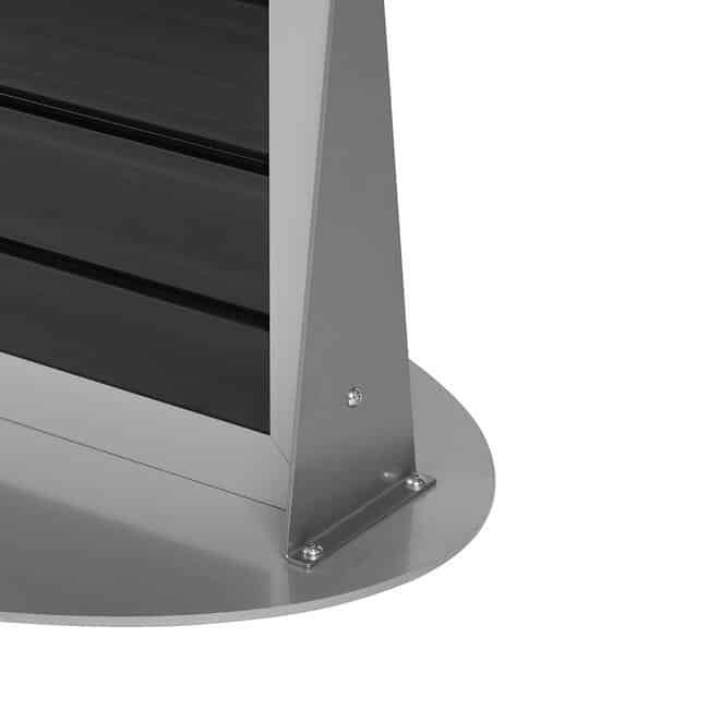 Tämä houkutteleva urapaneeliteline tarjoaa tilaa molemmille puolille tuotteiden tai esitteiden esittelyä varten. Sopivilla lisävarusteilla, kuten koukkuilla, hyllyillä tai esitetelineillä, voit mukauttaa tuotteiden esittelyn tarpeidesi mukaan. Telineen kokonaiskorkeus on 1600 mm, joten myyntialue pysyy näkyvissä. Telinettä vakauttaa elliptinen teräslevy. Se on ruuvattu yläosan hopeanväriseen anodisoituun runkoprofiiliin yhdessä vakauttavien tukien kanssa.