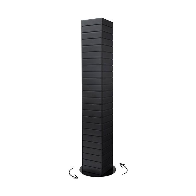 Tämä urapaneelein varustettu lattiateline tarjoaa tyylikkään ja modernin esittelyalustan tuotteillesi. Nelisivuisen telineen muotoilu tekee vaikutuksen mustilla jauhemaalatuilla alumiinikulmaprofiileillaan. Tukevan teräsjalustan ja integroidun pyörivän elementin ansiosta näkyvyys on taattu joka suunnasta.