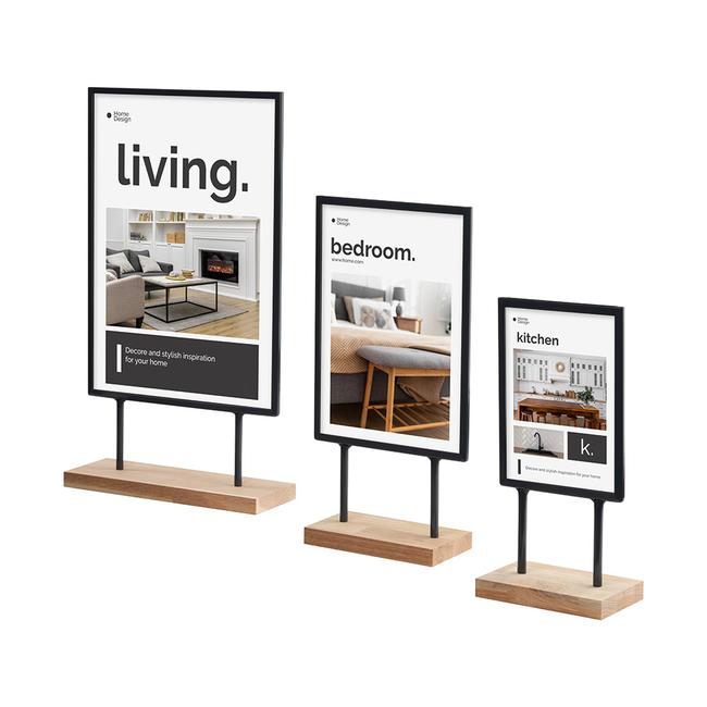 Pöytäteline on saatavana kolmessa eri koossa. Sisältö on joustava ja riippuen mallista, siihen mahtuu A3-, A4- tai A5-kokoisia tulosteita. Laajan valikoiman ansiosta voit esittää viestisi parhaalla mahdollisella tavalla.