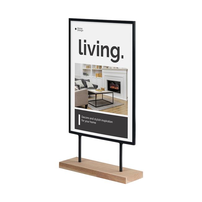 Julisteteline ”Kuvero” on välttämätön mainosväline tarjousten ja tietojen esittelyyn. Aseta tyylikäs metallista ja puusta valmistettu jalusta mainospöydille, myyntitiskeille tai näyteikkunoihin. Pöytäjalusta takaa modernin ulkonäön ja herättää asiakkaiden huomion.