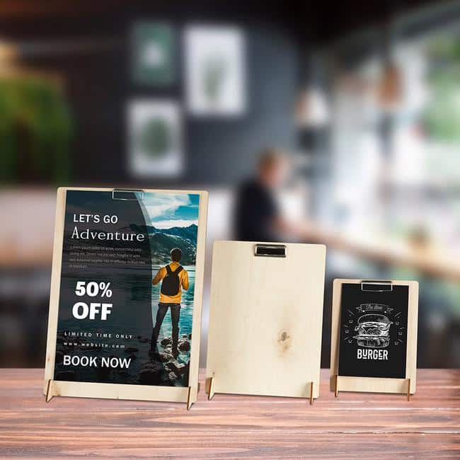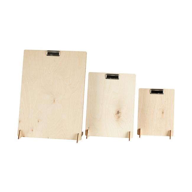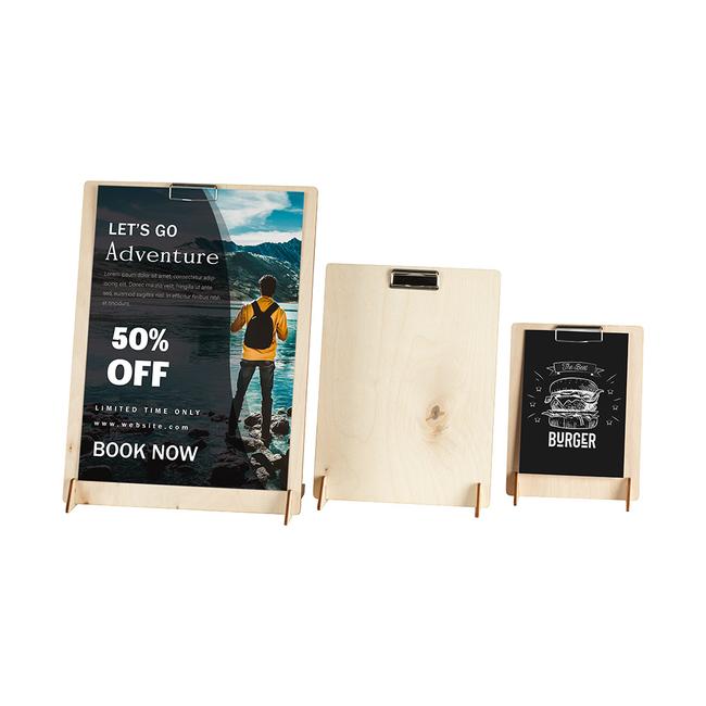 3-osainen teline on valmistettu vanerista ja se on helppo kasata. Kromattu klipsi tulosteelle on jo asennettu toimituksen yhteydessä ja se pitää tulosteen tukevasti paikallaan.