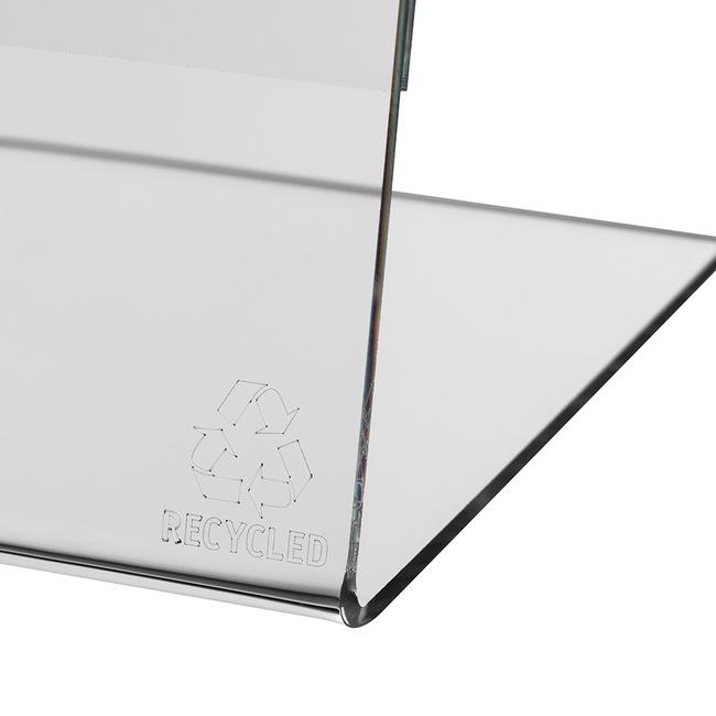L-teline ”Classic” on valmistettu 90-prosenttisesti kierrätysmateriaalista ja on täten monipuolinen ja kestävä tuote. Se tekee vaikutuksen erittäin läpinäkyvällä ja kiiltävällä pinnallaan, joka ei vain kiinnitä huomiota, vaan myös esittelee viestisi houkuttelevalla tavalla. Hienovarainen kaiverrus kertoo myös kierrätetystä raaka-aineesta.
