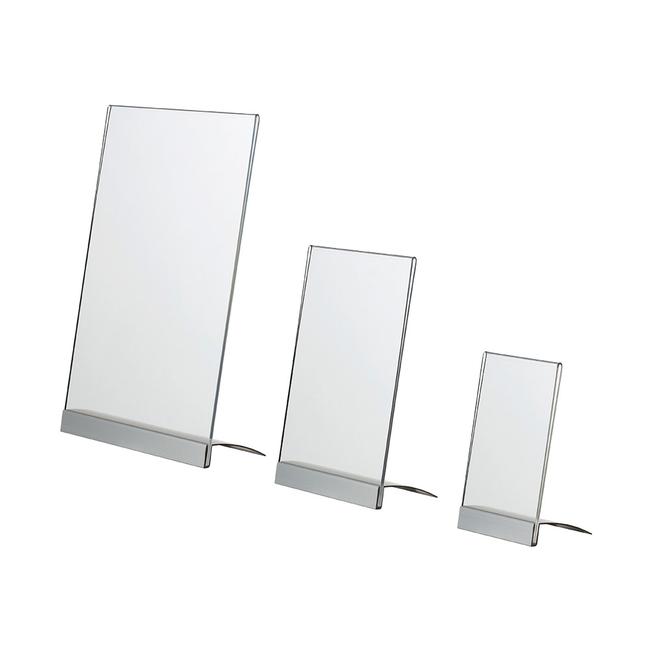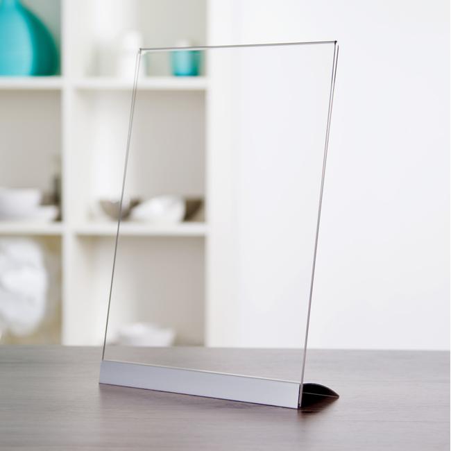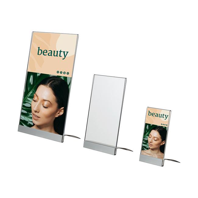 Moderni Taxus-telineemme esittelee yksittäiset tulosteet tyylikkäästi. Hieman kallistettu kulma on ihanteellinen lukemiseen. Takapuolelta pyöristetty alumiinijalusta takaa tukevan seisomisen. Tulosteet voidaan helposti liu’uttaa akryylitaskuun.