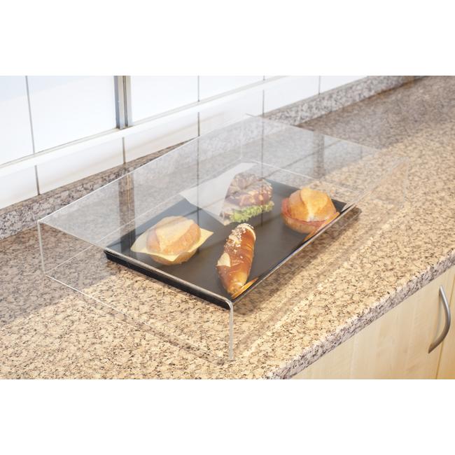 Tämä kauniisti muotoiltu suoja on helppo asettaa tuotteiden päälle, ja siinä on tilaa jopa tarjottimelle. Käytä suojaa tuoretuotteiden tiskillä, tarjouspöydillä tai myyntitiskillä. Kirkas akryyli antaa asiakkaillesi selkeän näkymän tarjolla oleviin tuotteisiin.