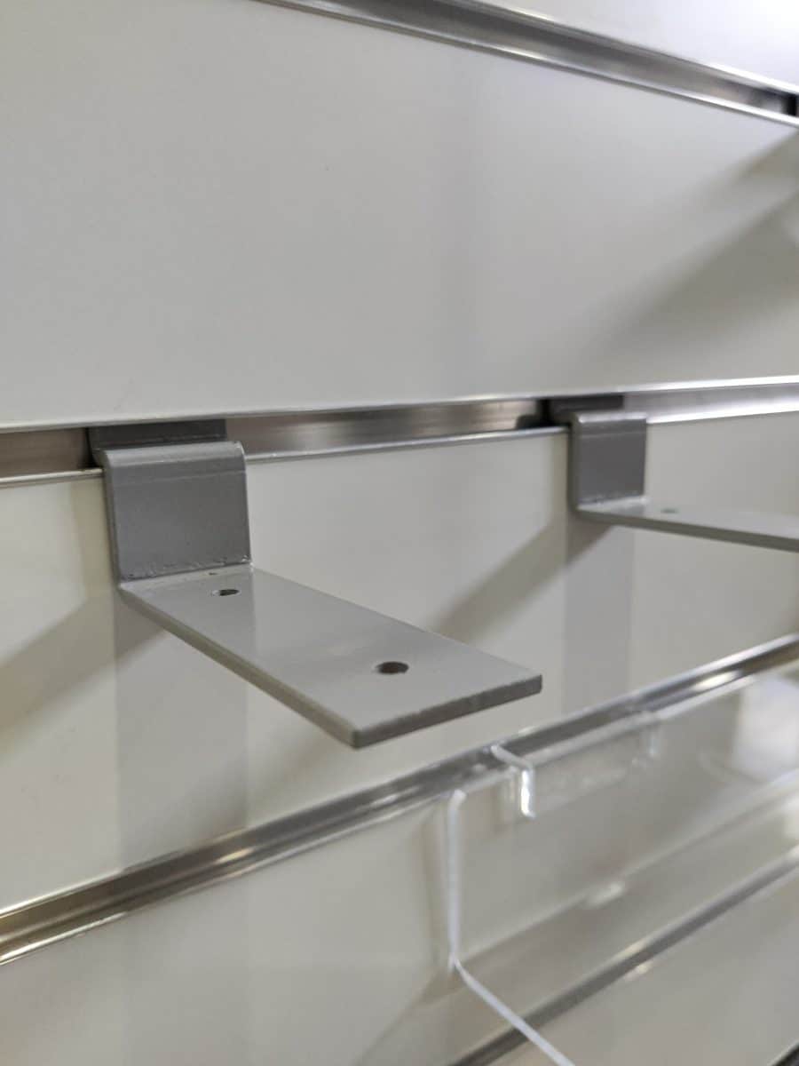 Metallinen hyllynkannatin urapaneeliin pienemmille hyllytasoille.