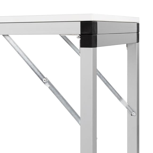 Kokoontaitettava myyntipöytä ”Construct” on erittäin monipuolinen. Siinä yhdistyvät keveys ja vakaus, joten se sopii erinomaisesti messuille, näyttelyihin tai myymälän sisustukseen. Pohjakehys on valmistettu hopeaksi anodisoidusta alumiinineliöputkesta, ja se voidaan taittaa helposti kokoon saranoiden avulla. Näin pöytä voidaan pystyttää ja purkaa nopeasti, ja se vie hyvin vähän tilaa kuljetuksen aikana.
